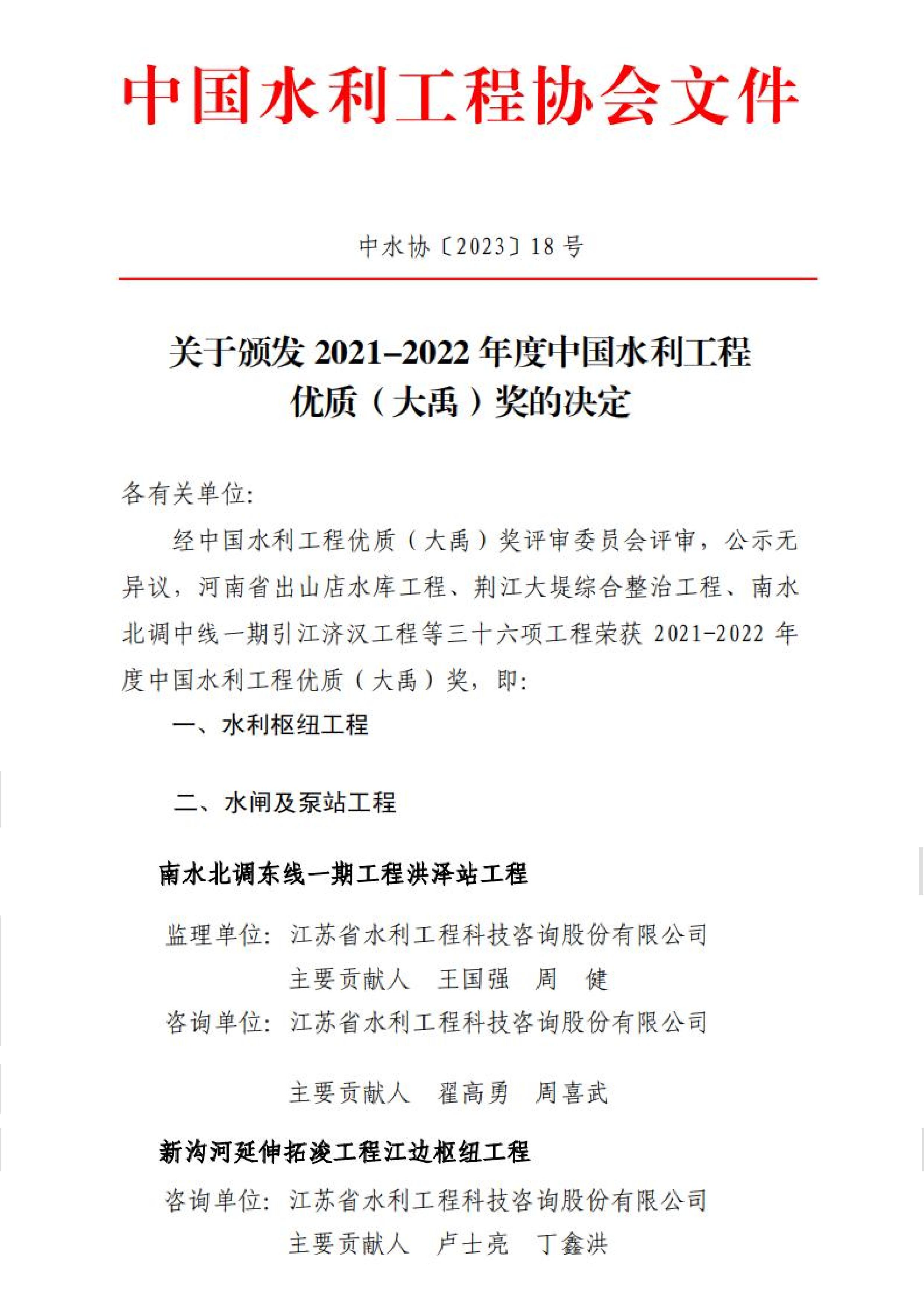 近日,根據(jù)中國(guó)水利工程協(xié)會(huì)發(fā)布的《關(guān)于頒發(fā)2021-2022年度中國(guó)水利工程優(yōu)質(zhì)(大禹)獎(jiǎng)的決定》(中水協(xié)〔2023〕18號(hào)),由我公司監(jiān)理、咨詢的南水北調(diào)東線一期工程洪澤站工程,咨詢的新溝河延伸拓浚工程江邊樞紐工程榮獲中國(guó)水利工程優(yōu)質(zhì)(大禹)獎(jiǎng)稱號(hào)。