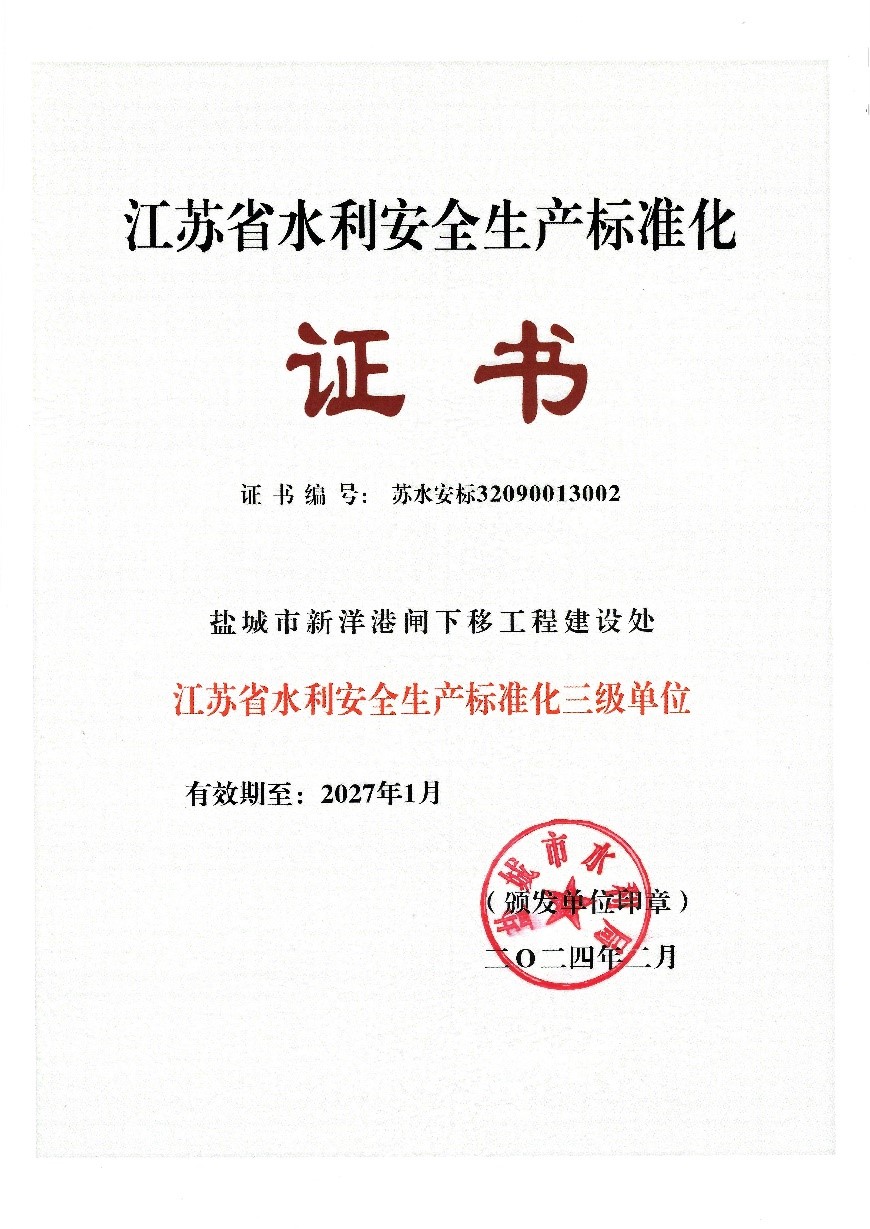 | 新洋港閘下移工程創(chuàng)成安全生產標準化三級作者:admin 來源: 日期:2024-3-26 8:56:15 人氣: