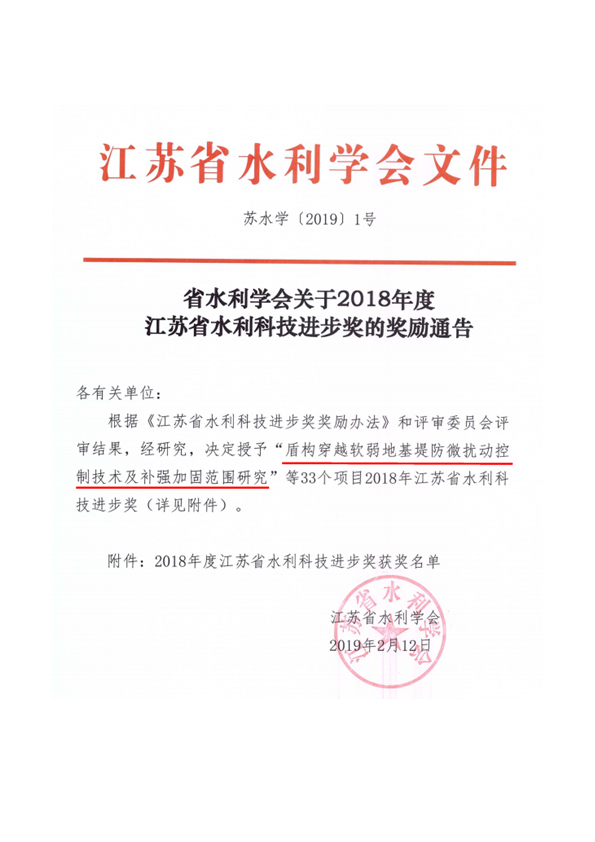 近期,我公司主持完成的《盾構穿越軟弱地基堤防微擾動控制技術及補強加固范圍研究》喜獲2018年度江蘇省水利科技進步一等獎。