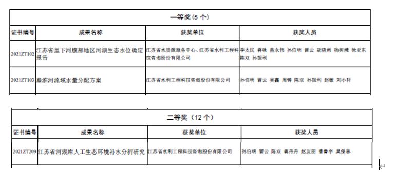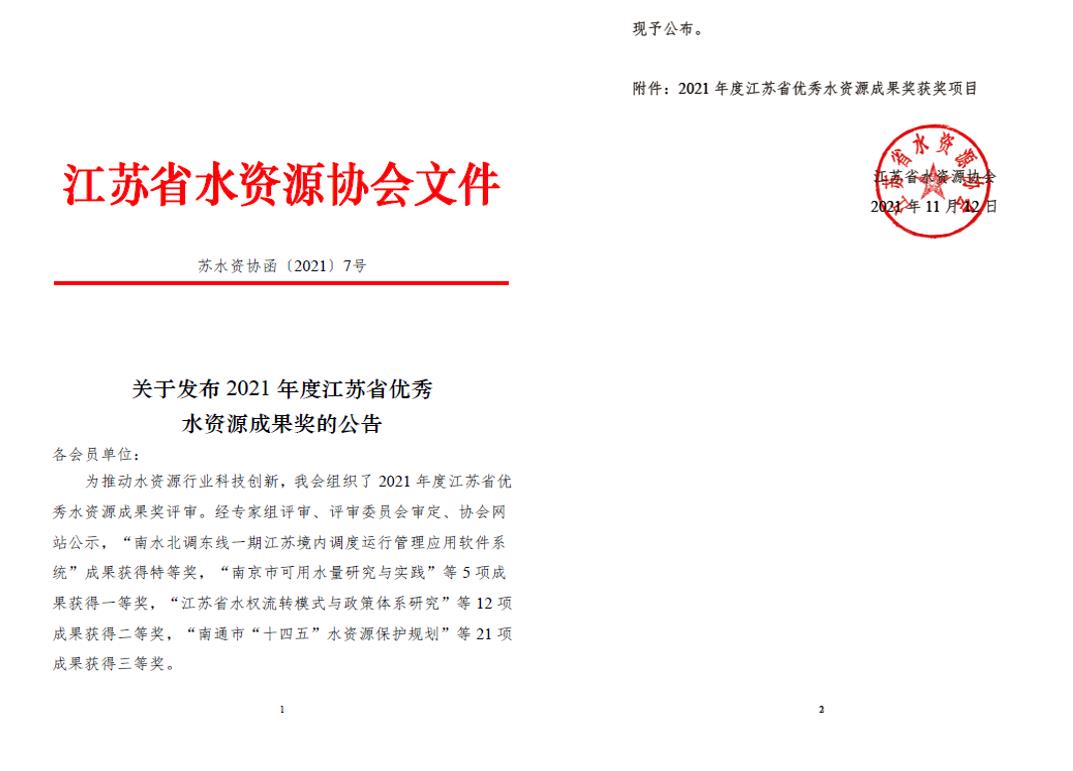 近日,“2021年度江蘇省優(yōu)秀水資源成果獎”揭曉,我司成果豐碩。我司編制的《秦淮河流域水量分配方案》、《江蘇省河湖庫人工生態(tài)環(huán)境補(bǔ)水分析研究》分別榮獲一等獎、二等獎,公司參與的《江蘇省里下河腹部地區(qū)河湖生態(tài)水位確定報(bào)告》獲一等獎。