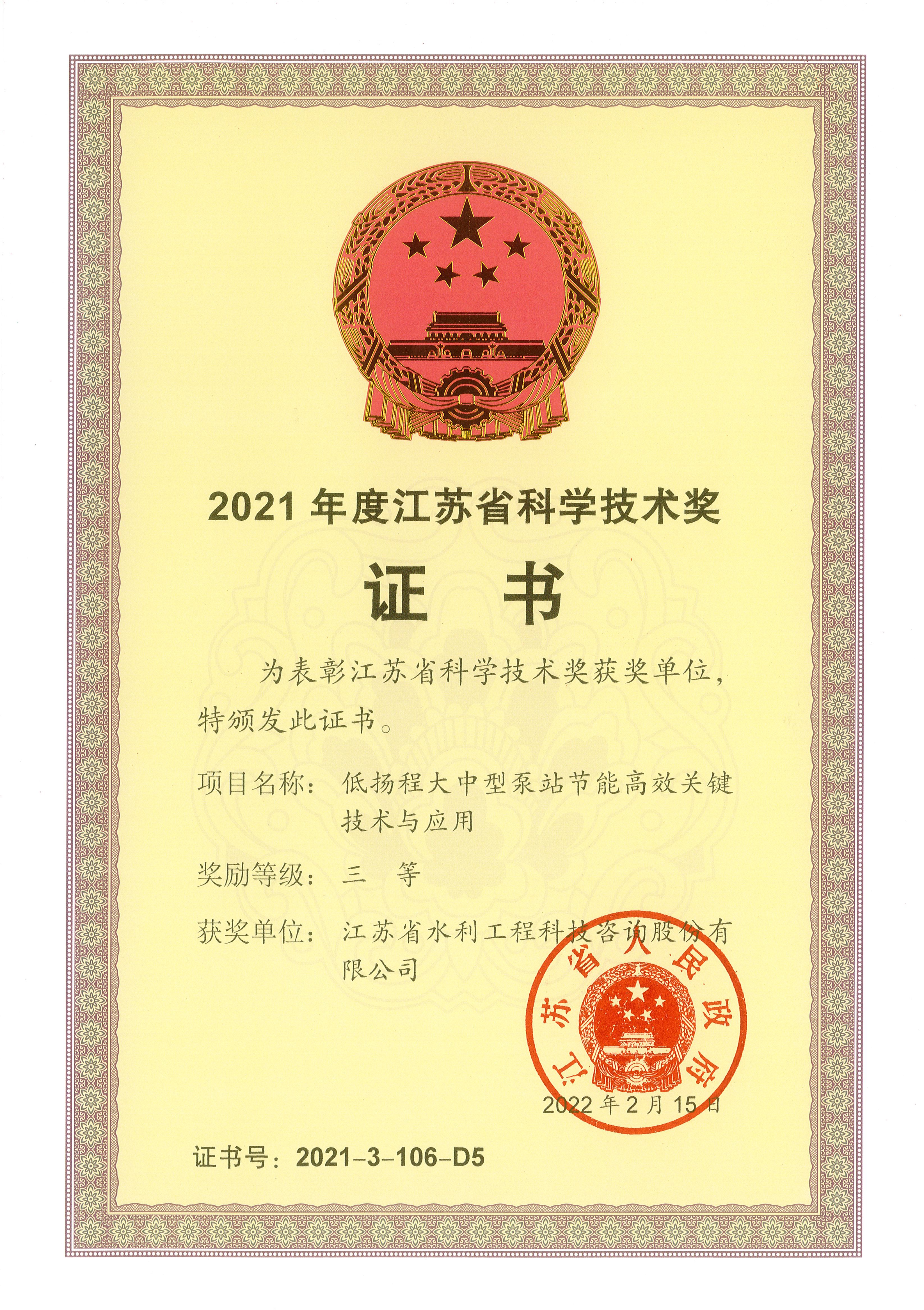 近期,我公司參與完成的《低揚程大中型泵站節(jié)能高效關(guān)鍵技術(shù)與應(yīng)用》項目喜獲2021年度江蘇省科學(xué)技術(shù)獎三等獎。